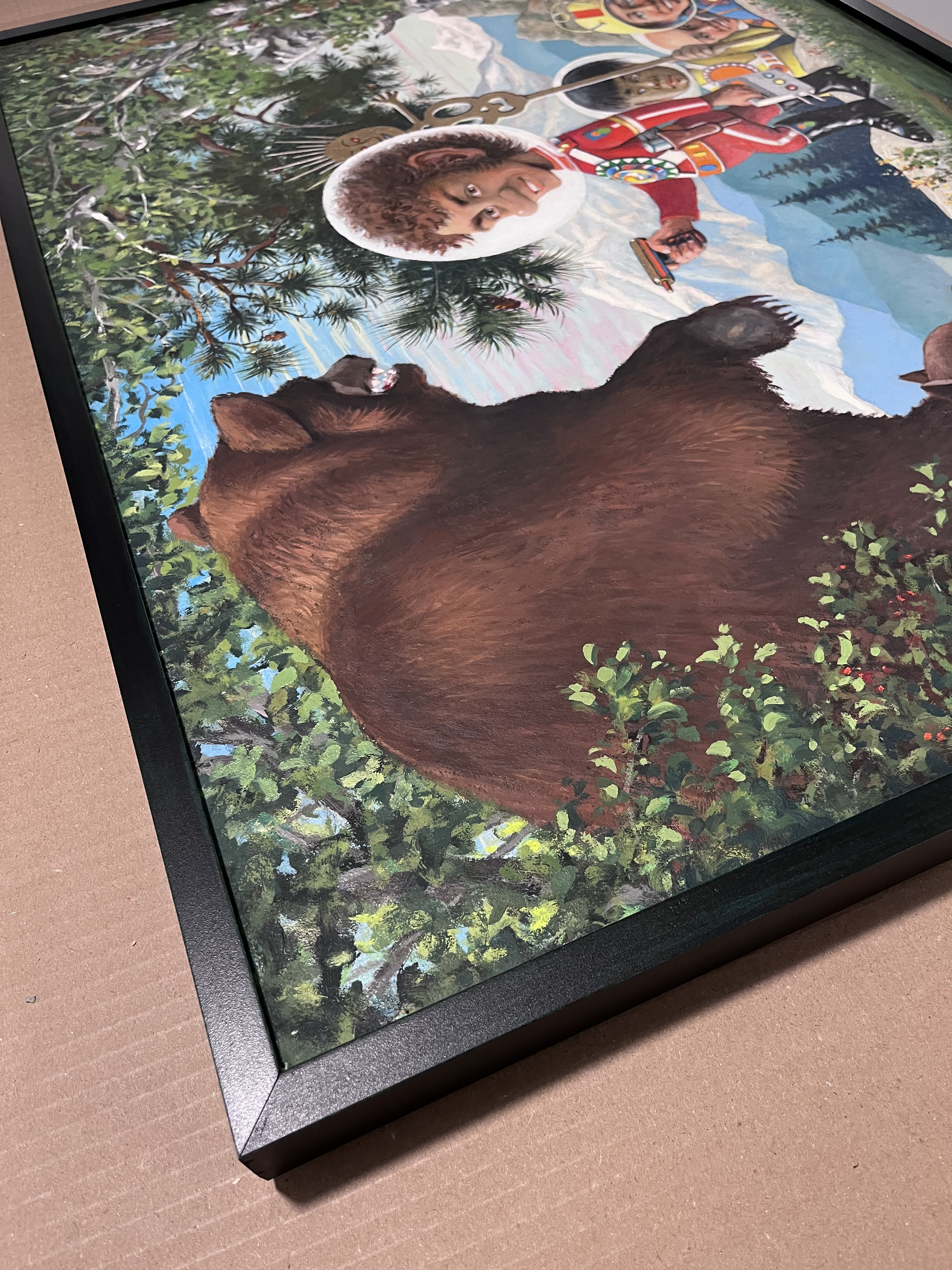 The hand dyed almost black green maple cap complements these visionary paintings by Ralph Clark