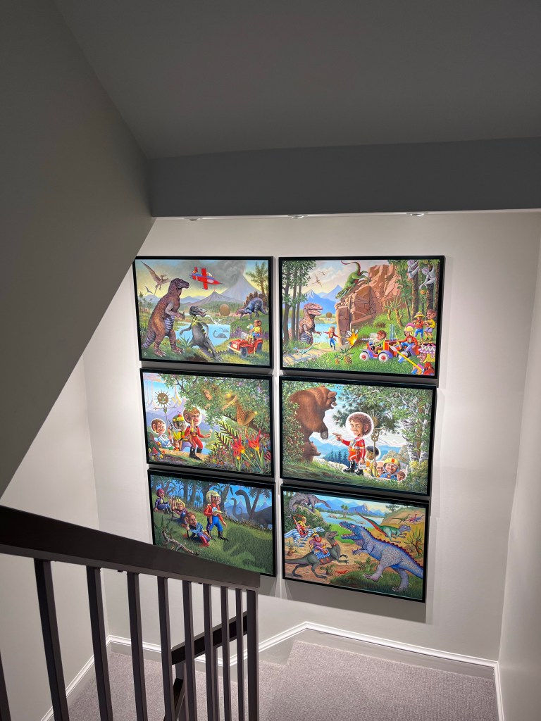 My client asked for almost black green frames for these bright Ralph Clark paintings on panel.