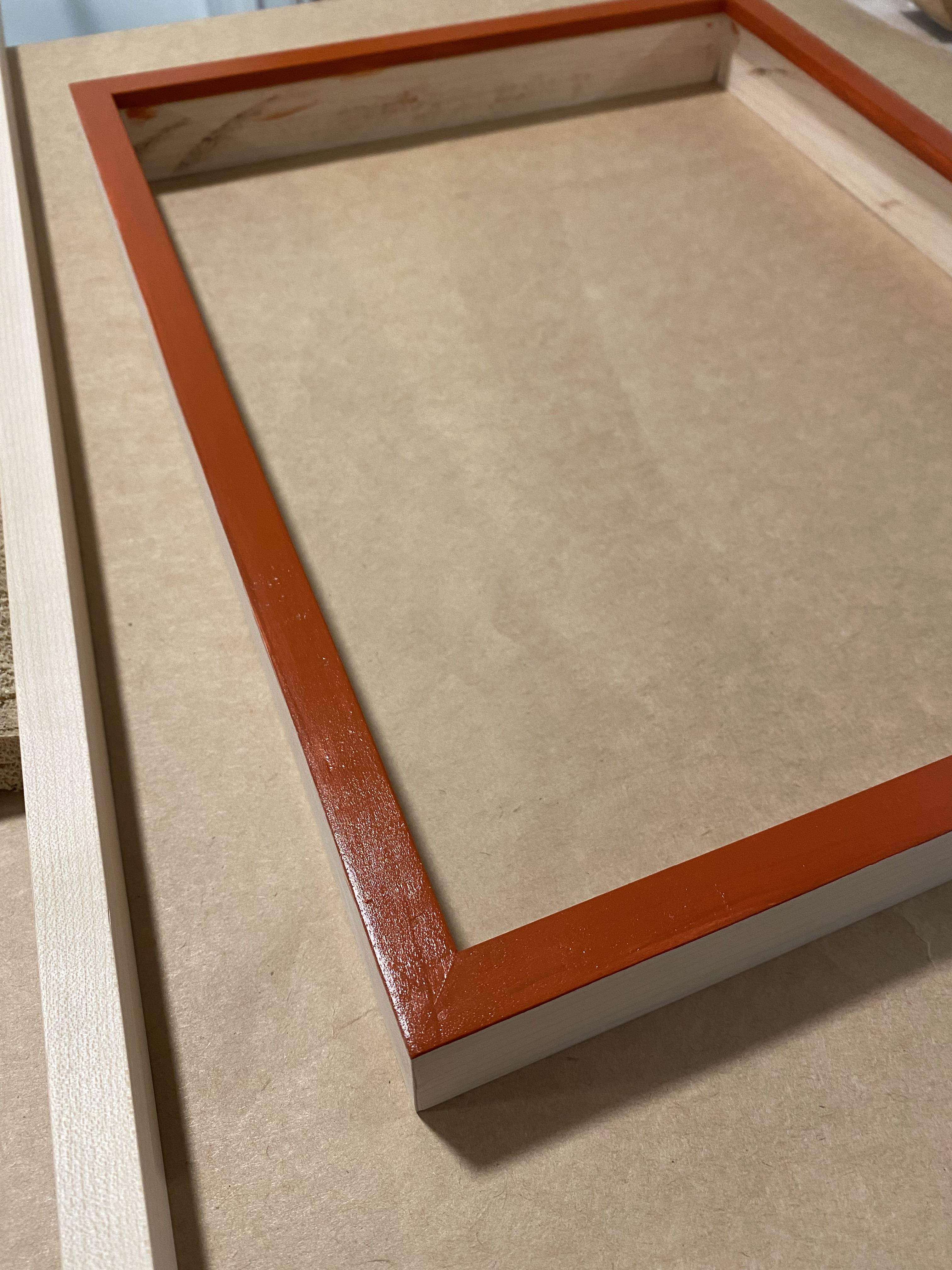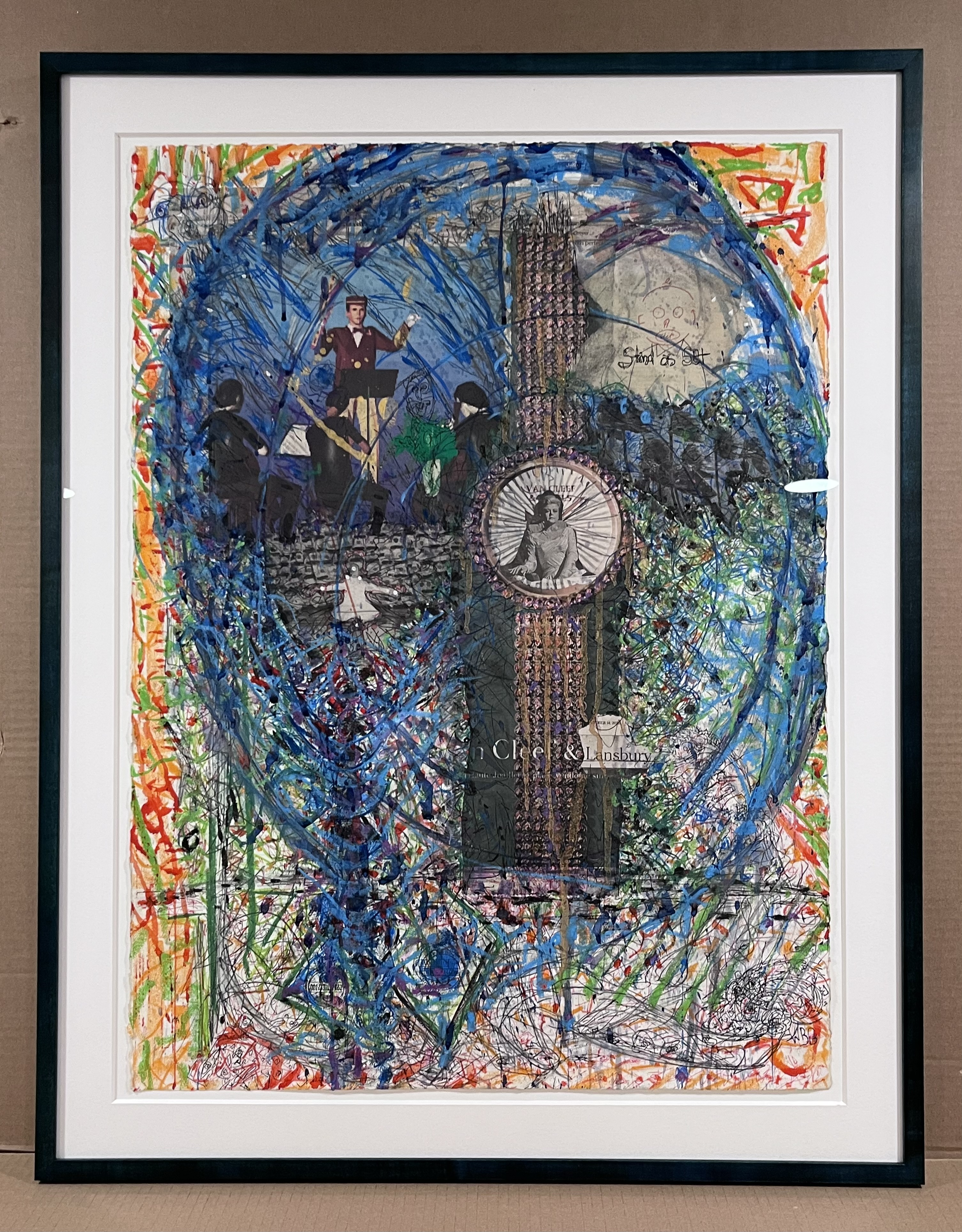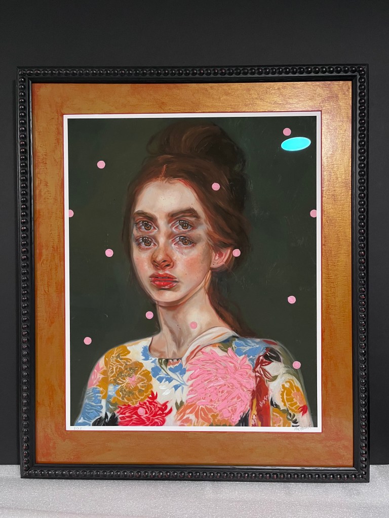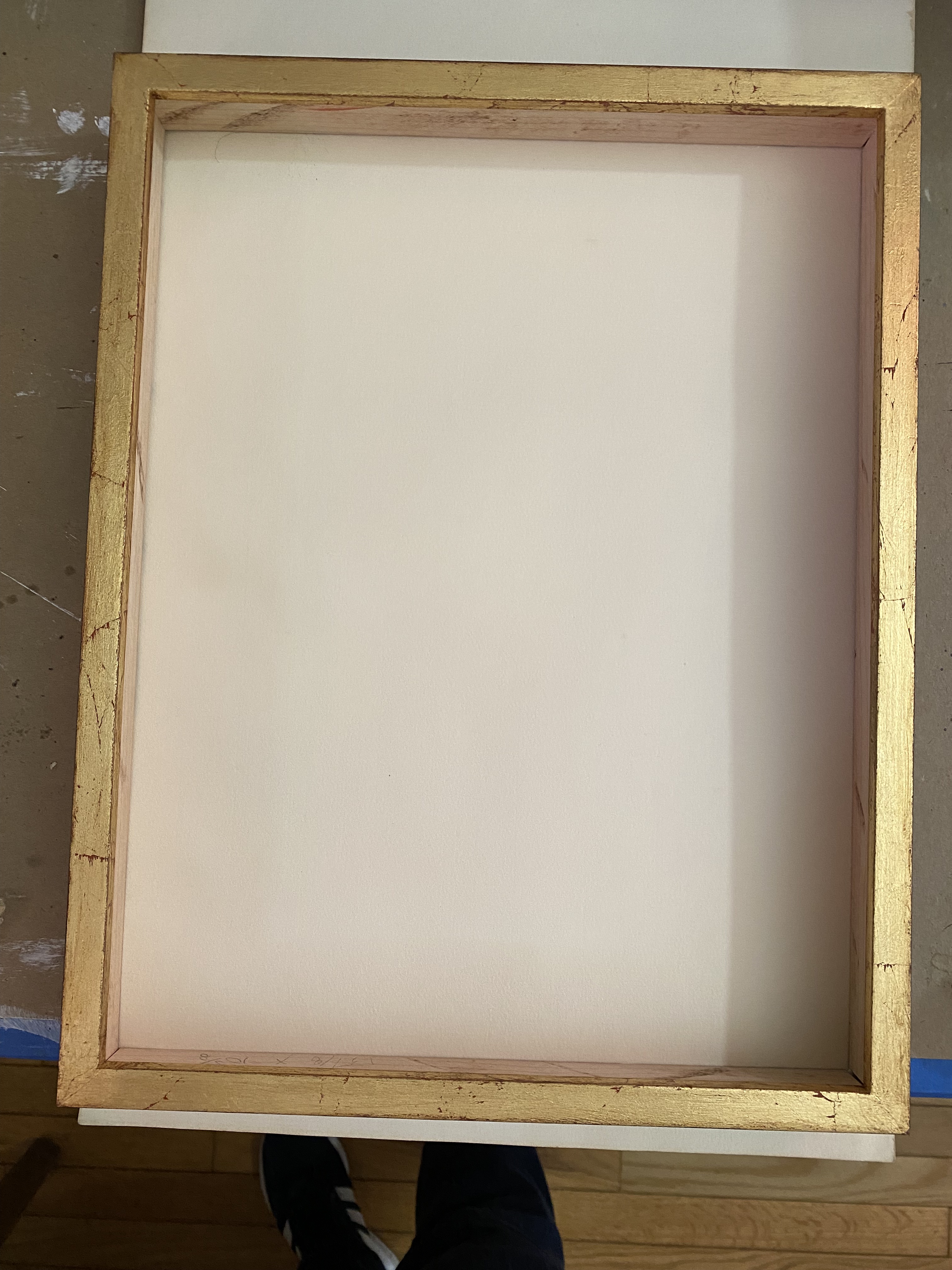 in-house stained maple cap frame this deep blue/green accentuates the dynamic color of the art