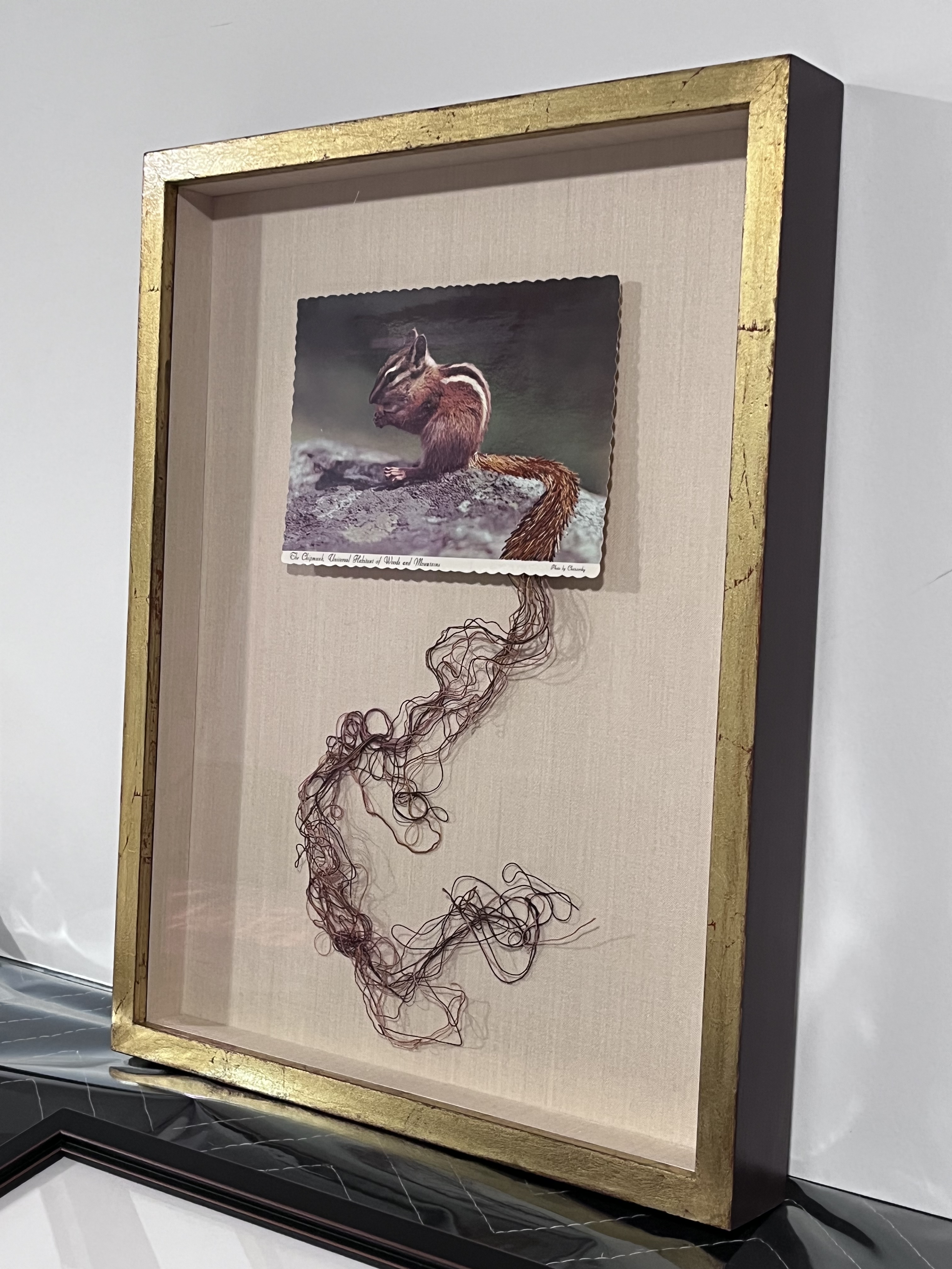 handmade in-house gold leaf cap with deep umber sides for this delightful squirrel embroidered postcard